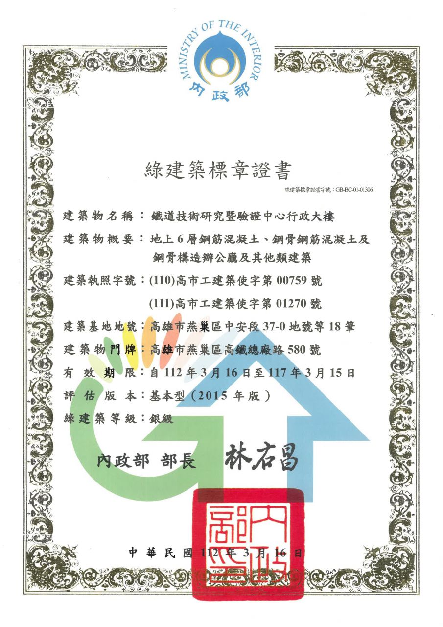 鐵研中心行政大樓綠建築標章銀級證書(另開視窗)